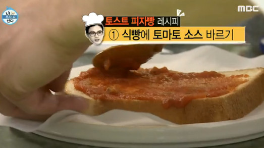 먼저 식빵에 스파게티 소스 또는 토마토 페이스트 소스를 발라줍니다.