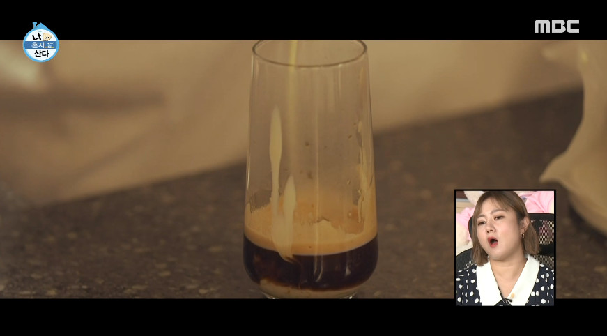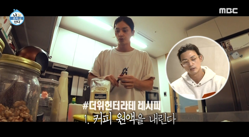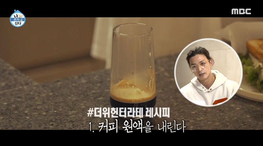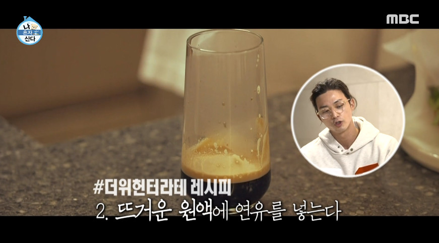 김지훈 더위사냥 토스트와 함께 먹을 음료는 김지훈이 직접 만든 더위헌터(더위사냥)맛 라떼입니다. 김지훈 더위헌터 만드는 법은 먼저 커피 원액을 내린 후 뜨거운 상태에서 연유를 3초동안 넣습니다.