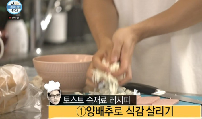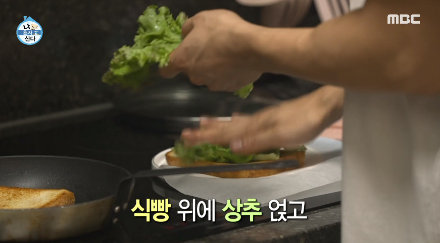 나혼자산다 김지훈 토스트 잘 구워진 식빵 위에 상추를 얹고 미리 만들어둔 양배추 속을 듬뿍 올려줍니다.