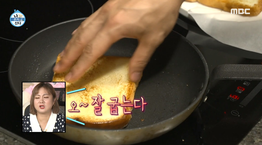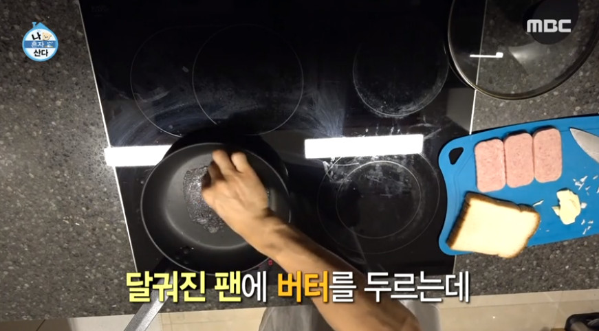 김지훈 토스트 만들기 달궈진 후라이팬에 버터를 두른 뒤 빵을 노릇노릇하게 구워줍니다.