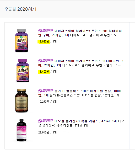 원래 얼라이브 구미 가격은 종류별로 다 똑같은데 저 때는 왜 차이가 났는지 모르겠네요. 멀티비타민 구미의 대체적인 가격은 1만 원 초중반대인데 저 때 우먼스 50+만 왜 저렇게 파격적인 가격으로 나왔는지는 저도 궁금하네요. 영양제를 종종 구입하다 보면 가끔씩 저렇게 뜬금없이 가격이 저렴한 상품들을 목격하고는 합니다.