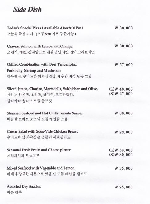 양주와 와인의 가격은 위와 같습니다. 메뉴판 내용이 너무 많아서 다 옮길 수는 없고 저희가 주문한 메뉴가 있는 부분만 따로 가져왔습니다.