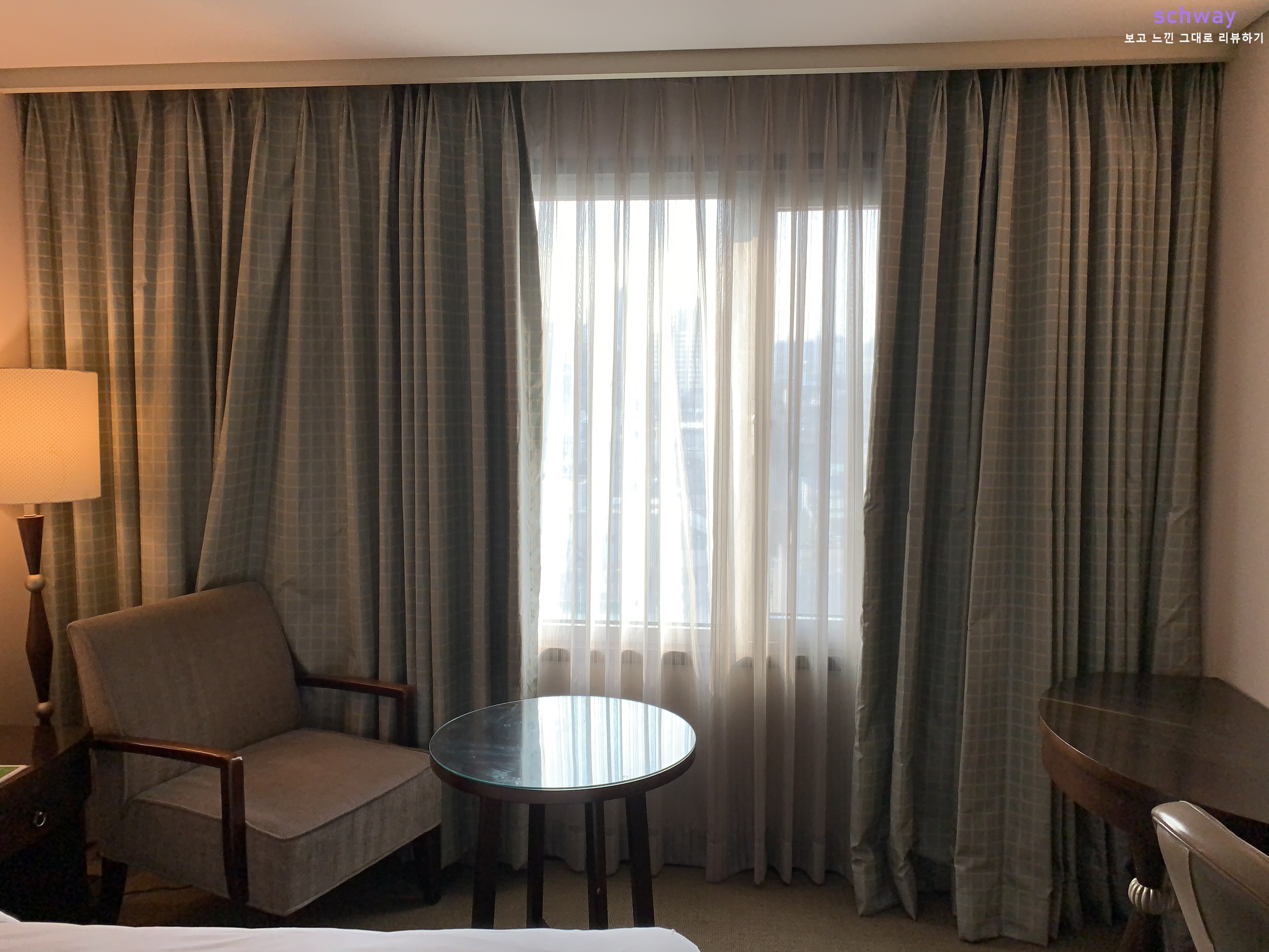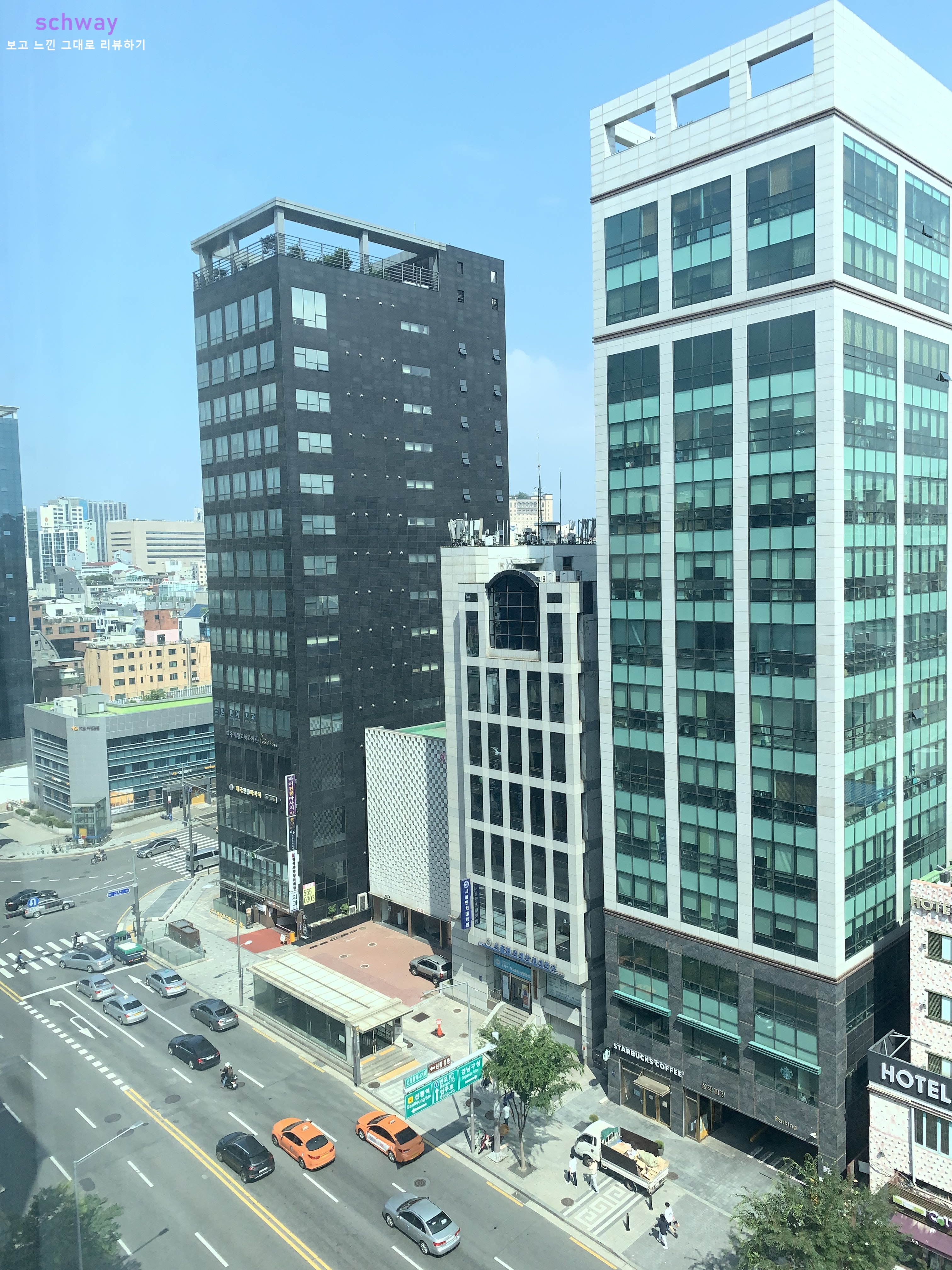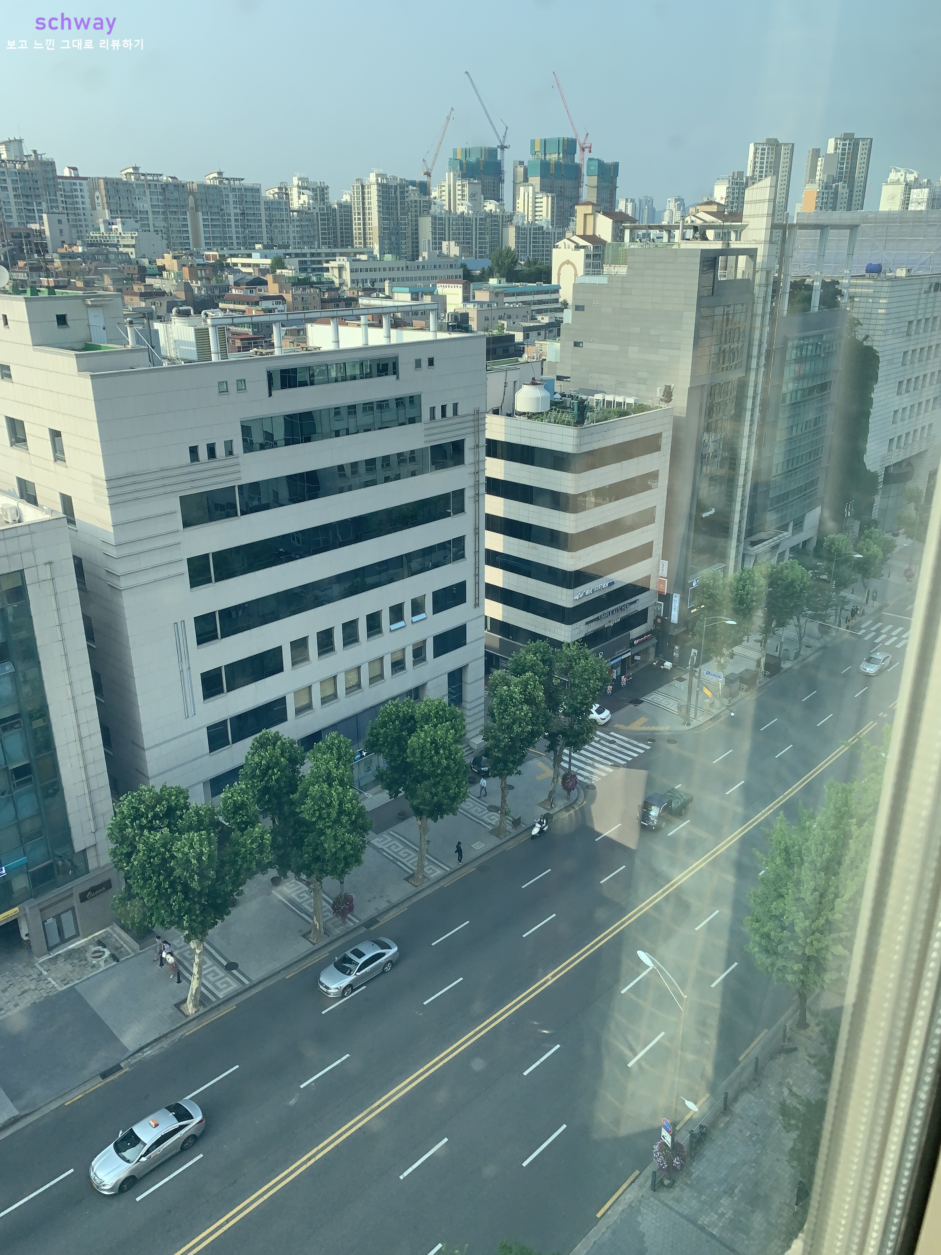 창문 밖으로 볼 건 건물 밖에 없지만 다음 날은 날이 맑아서 기분이 좋았네요. 혹시 라마다 서울 강남 호텔 예약하시게 되면 저희처럼 도로 쪽이 아닌 반대편 선릉 공원 쪽으로 예약하시길 바랍니다. 훨씬 조용하고 초록초록한 숲 속을 볼 수 있어서 작게나마 힐링에 도움이 된다고 생각하네요.