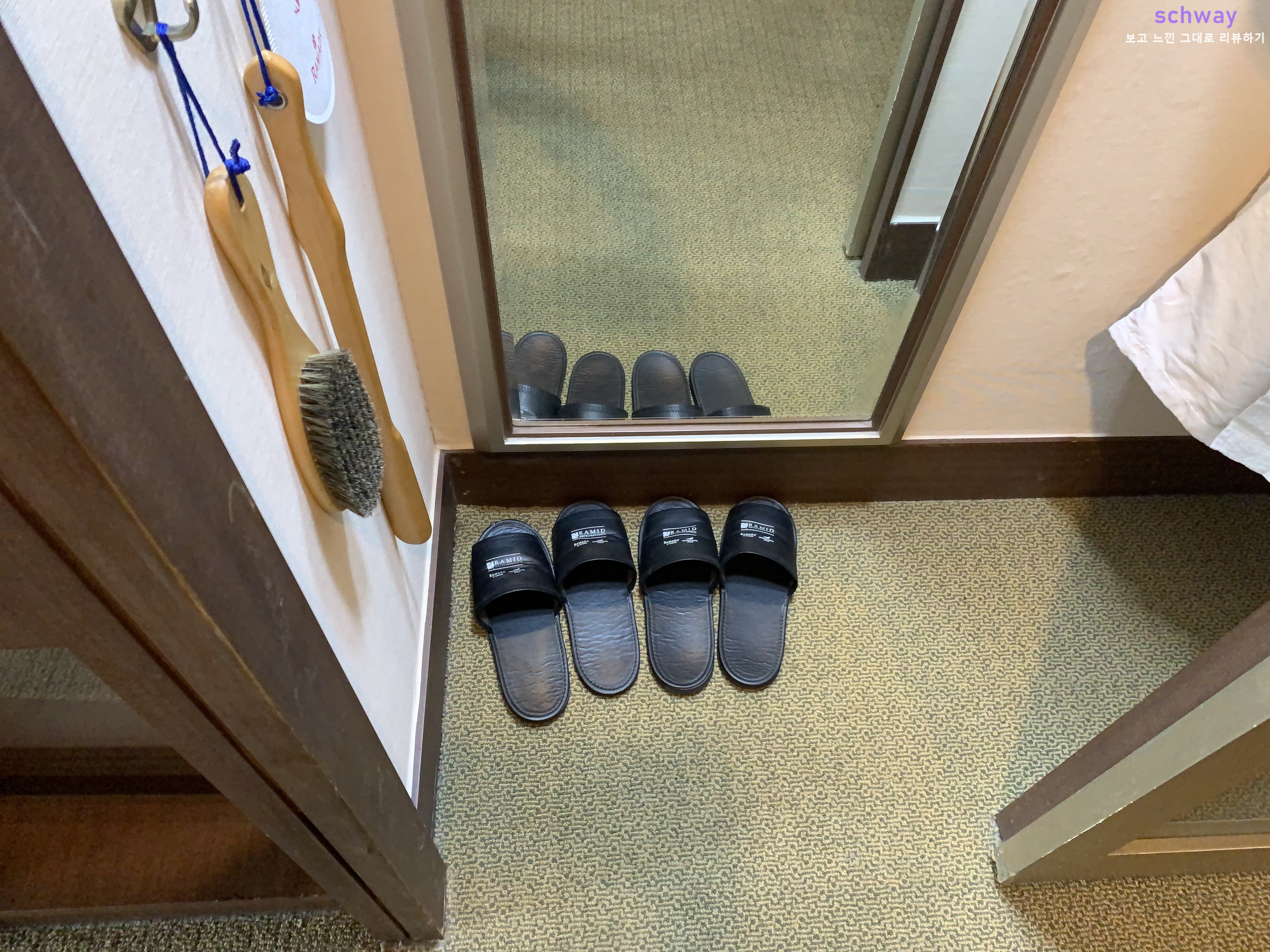 불투명한 미닫이 문을 열면 전신 거울이 있고 실내화, 슬리퍼, 가운 그리고 다리미, 다리미판이 있습니다.
