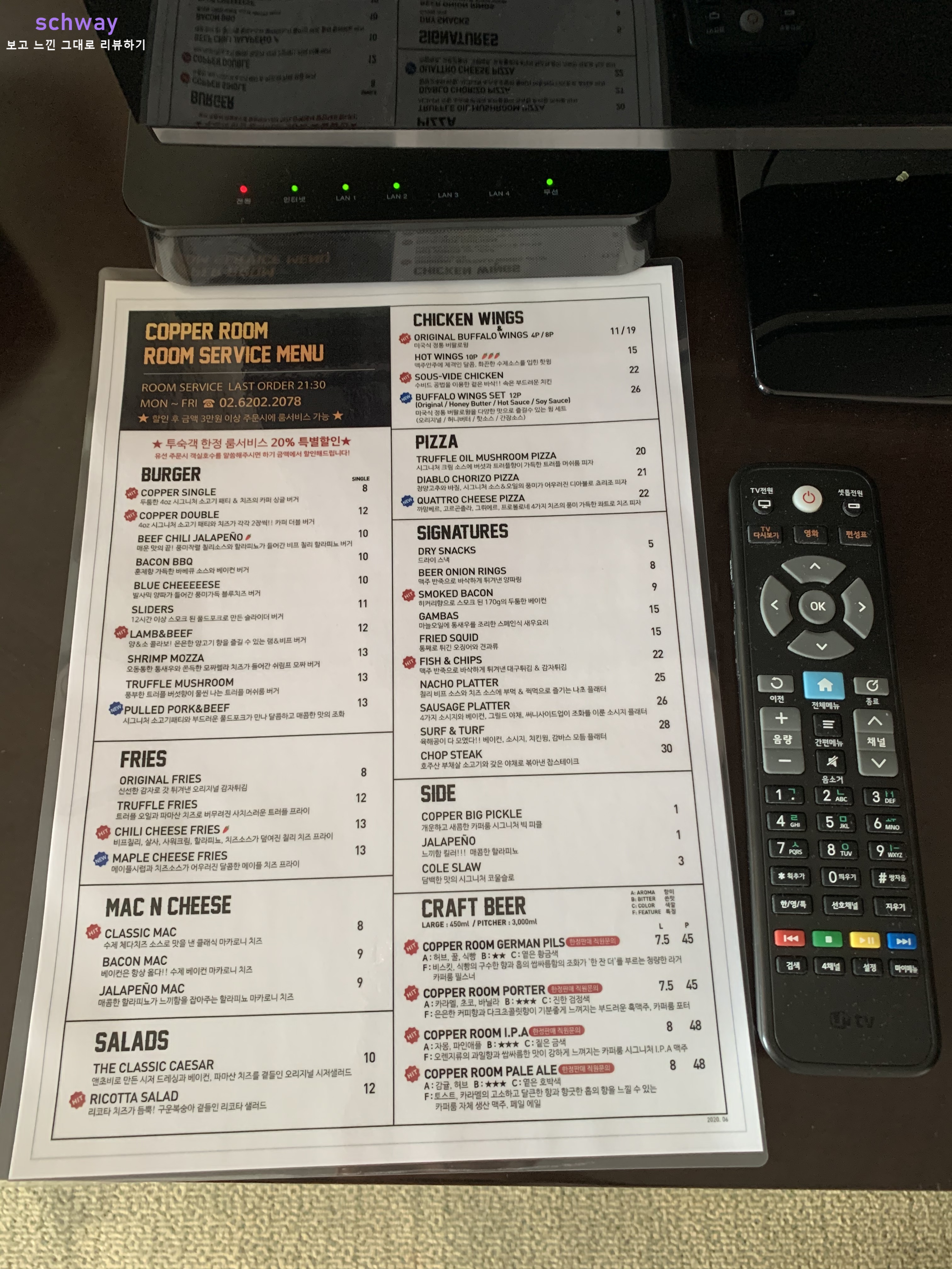 호텔 지하에 있는 카퍼룸이라는 식당에서 수제 버거와 수제 맥주 배달이 가능합니다.