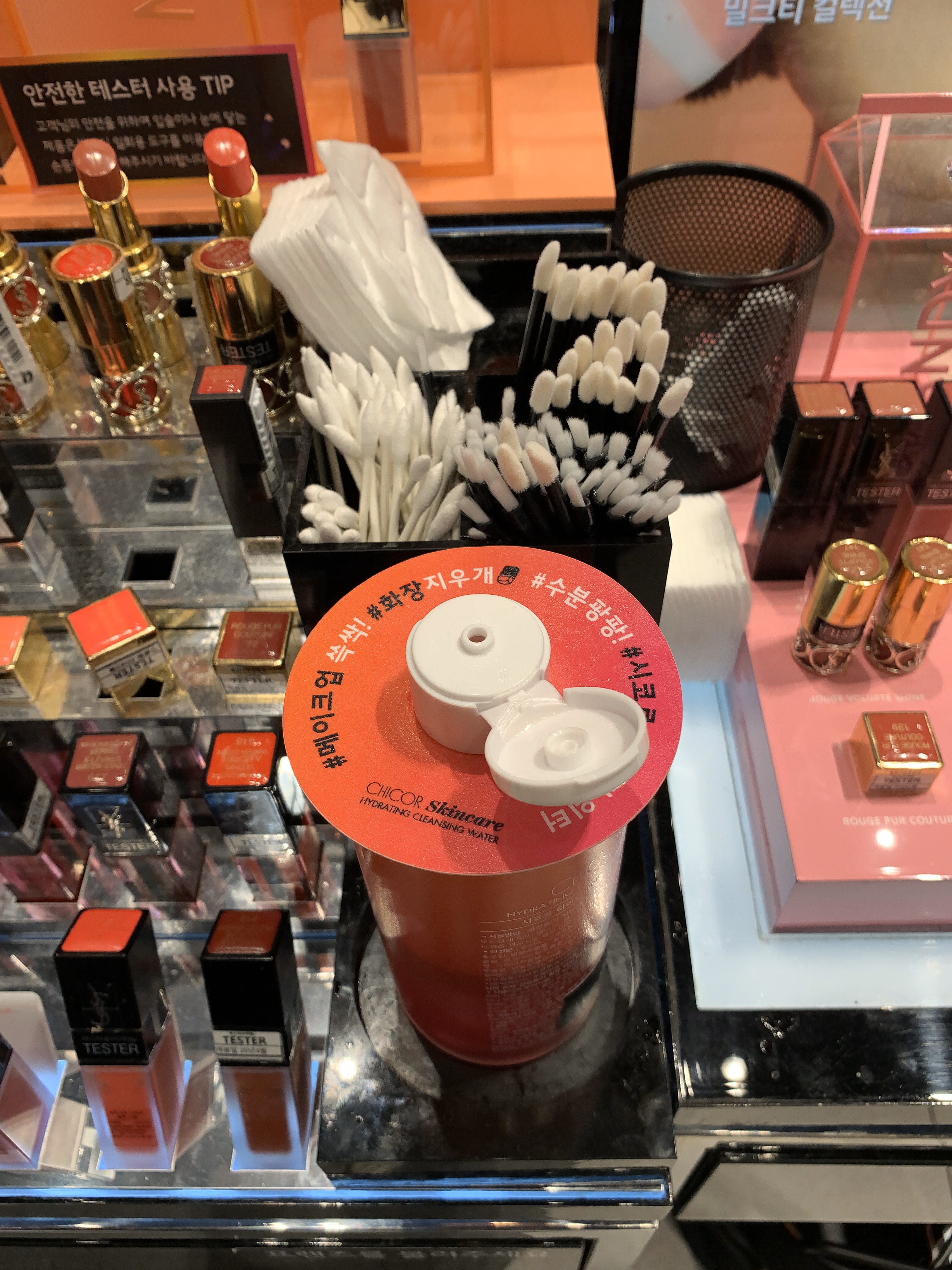 모든 테스터들이 그렇지만 특히 립 제품의 테스터는 각별히 주의하셔서 사용하시길 바랍니다. 안전하게 테스터를 이용할 수 있는 일회용 도구가 모든 화장품 코너 한쪽에 준비되어 있으니 용도에 알맞게 이용하세요.