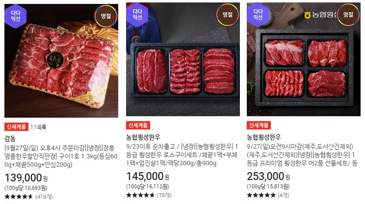 프리미엄 소고기 한우를 싫어하는 사람은 없기 때문에 이럴 때 한우 선물을 하는 것도 좋은 것 같습니다. 여유가 되신다면 부채살, 채끝, 등심, 업진살, 안심 등 부위별로 구성되어 있는 한우 선물 세트로 구입해서 명절 때 가족 다 같이 모여서 소고기 파티를 하시는 것도 좋을 것 같습니다. 사실 제가 소고기를 먹고 싶어서 알아보는 중입니다.
