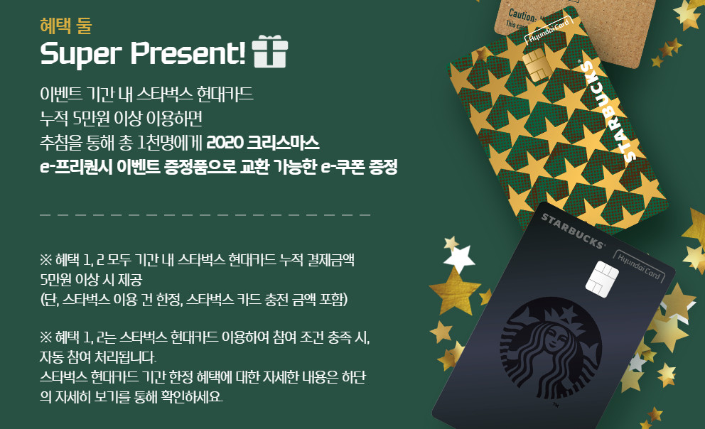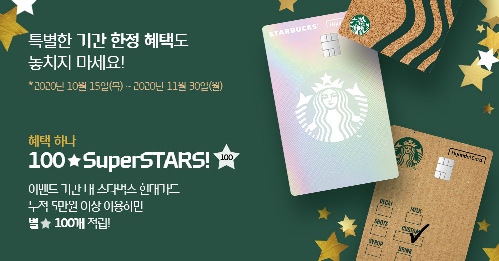 국내외겸용(VISA/MasterCard) 30,000원현대카드 스타벅스 신용카드 이용 고객은 스타벅스는 물론 국내외 어디서든 카드 사용 시 별을 적립할 수 있습니다.