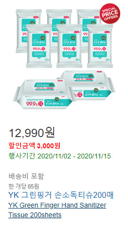 99.9% 살균소독으로 유해 세균으로부터 건강을 지켜 줄 수 있는 그린핑거 손소독 물티슈는 코로나 바이러스로 위생이 중요한 지금 필요한 제품입니다. 현재 3,000원 할인해서 12,990원에 판매 중입니다.